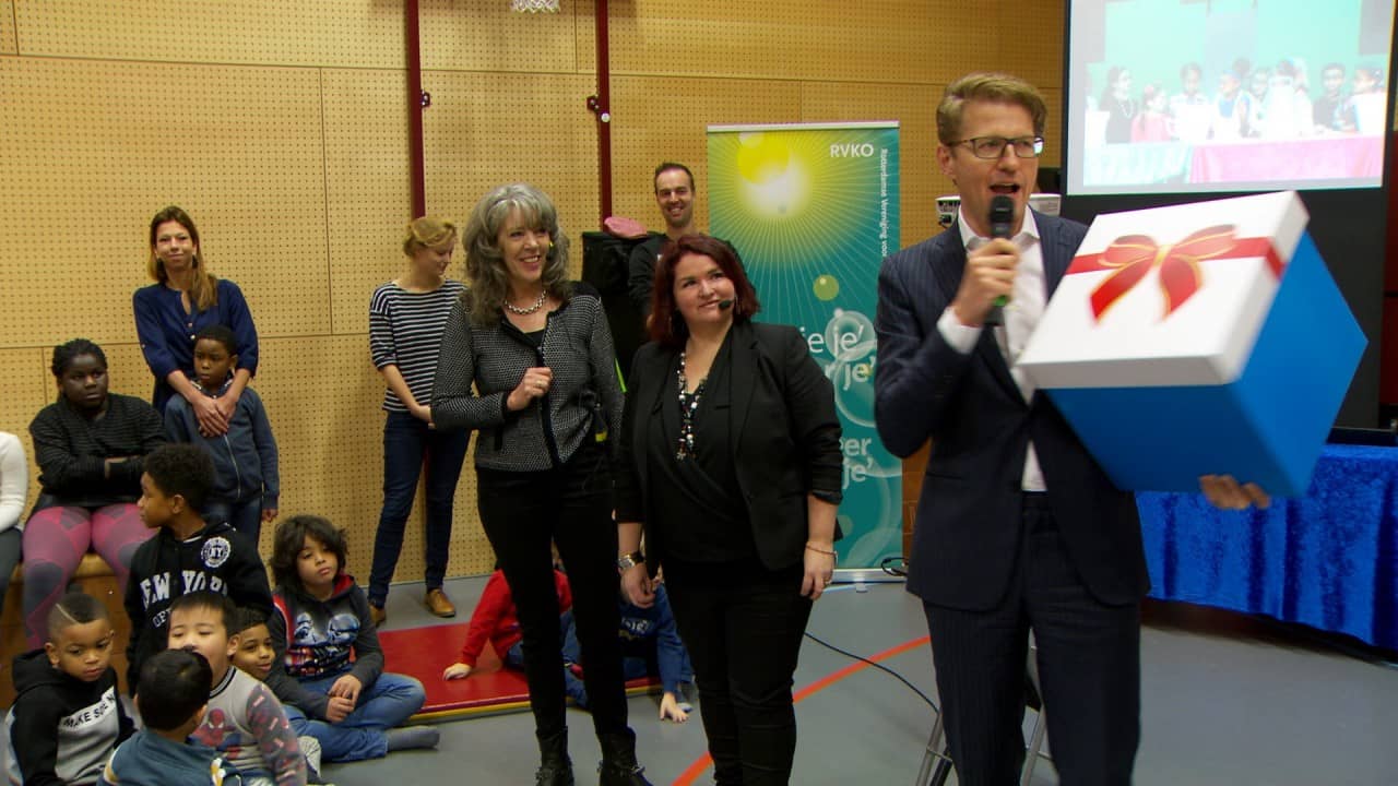 (Met een grote blauwe doos komt staatssecretaris Dekker aan in de gymzaal waar alle kinderen klaarzitten.)